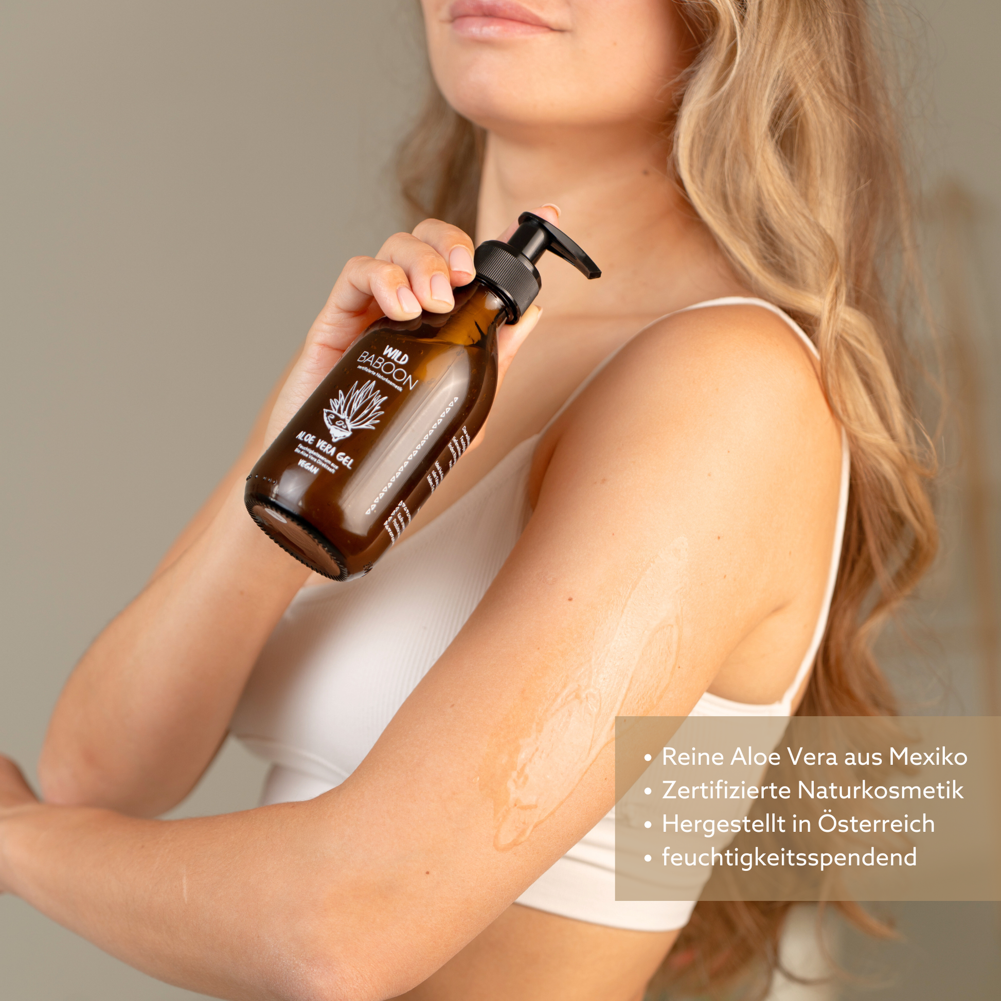 Das Wild Baboon Aloe Vera Gel ist ideal für die tägliche Gesichts- und Körperpflege. Es spendet intensive Feuchtigkeit, unterstützt die Zellerneuerung und ist ein Heilpflanzen-Serum für jeden Hauttyp. Deine Haut regeneriert schneller, wirkt sichtbar straffer und Unreinheiten werden vorgebeugt. Zudem ist das reine Aloe Gel ein natürliches Wachstumsserum für die Haare und beugt juckender Kopfhaut vor. Auch ist es eine kühlende Wohltat nach Sonnenbrand oder kleinen Schnittverletzungen, beispielsweise nach der Rasur. Ein echter Allrounder für die ganze Familie, der in keinem Haushalt fehlen sollte.