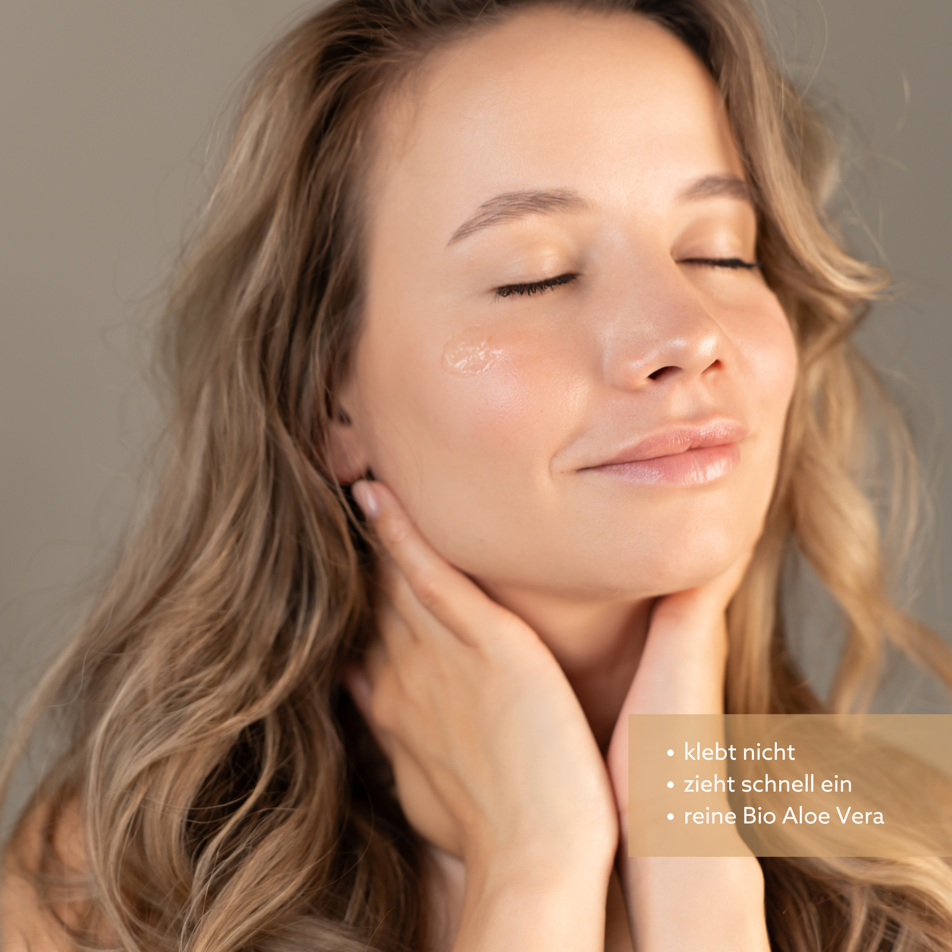 Nach dem Aufstehen durchfeuchtet das kühlende Aloe Gel deine Haut, verleiht einen frischen Teint und lässt die Haut straffer und belebter erscheinen. Am Abend ist es ein ideales leichtes Serum, das die Haut beruhigt und bei der Regeneration unterstützt. Es pflegt die Haut geschmeidig zart ohne zu kleben oder spannen.