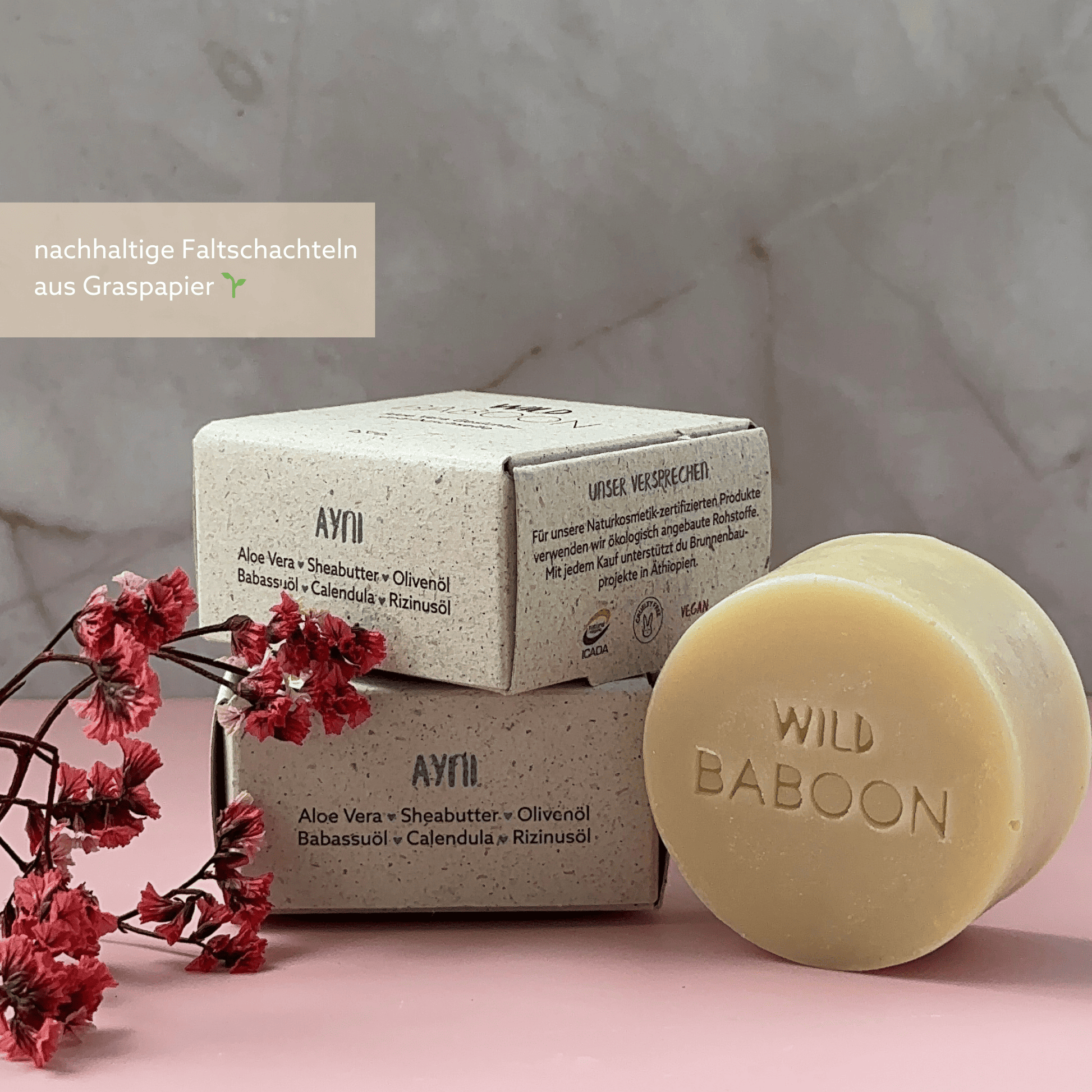 Die Naturseifen von Wild Baboon werden nicht auf Wasserbasis, sondern auf Aloe Vera Saftbasis hergestellt. Die Qualität im Vergleich zur normalen Naturseifen ist demnach deutlich höher. Es werden ausschließlich reine Bio Öle und Butter für die Seifen verwenden und liebevoll in Deutschland in einer Manufaktur von Hand hergestellt. Jede Seife wird einzeln gegossen und gestempelt. All unsere Öle und Butter sind mit dem höchsten Naturkosmetik-Standard, COSMOS, zertifiziert. Diese Seifen-Pralinen sind echter Luxus für unsere Haut.