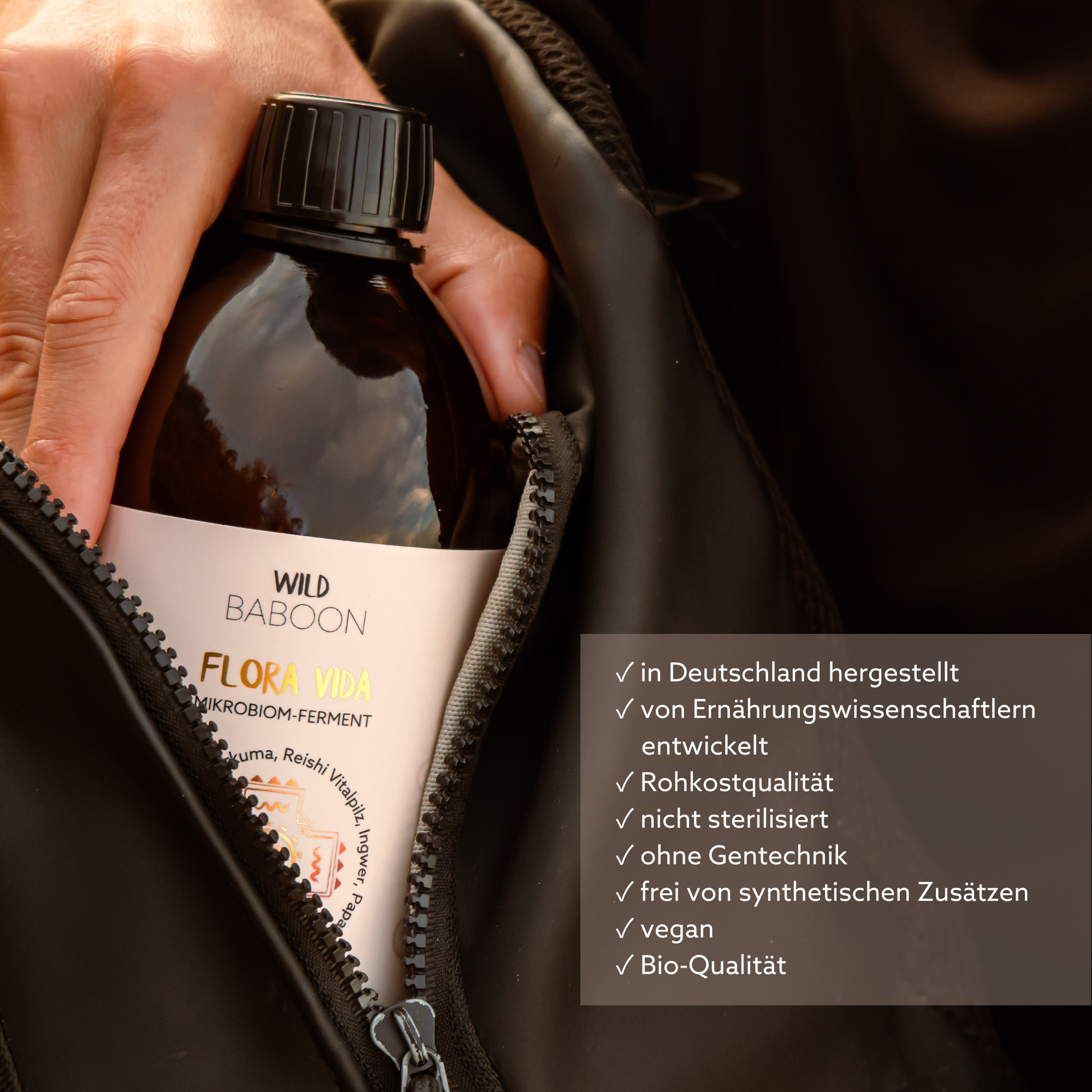 Im Gegensatz zu herkömmlichen Probiotika enthält FLORA VIDA keine isolierten Kulturen, sondern ein lebendiges, natürlich gewachsenes Ferment. Die 31 Mikroorganismen sind Teil des pflanzlichen Ferments und bilden gemeinsam mit Enzymen, sekundären Pflanzenstoffen und Vitalpilzen das Herzstück von FLORA VIDA.
