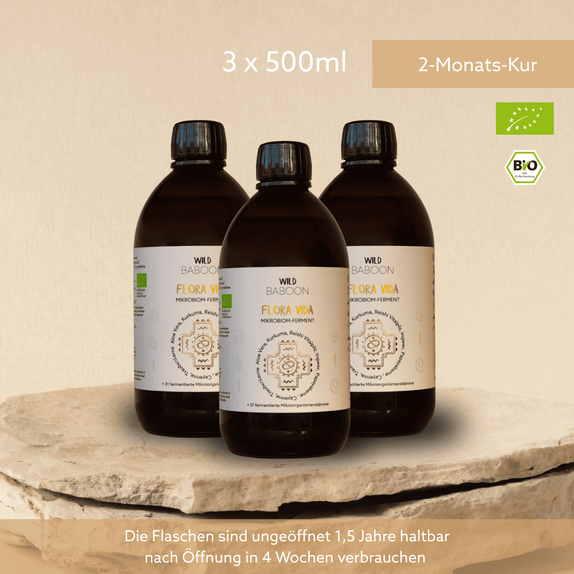 Im Gegensatz zu herkömmlichen Probiotika enthält FLORA VIDA keine isolierten Kulturen, sondern ein lebendiges, natürlich gewachsenes Ferment. Die 31 Mikroorganismen sind Teil des pflanzlichen Ferments und bilden gemeinsam mit Enzymen, sekundären Pflanzenstoffen und Vitalpilzen das Herzstück von FLORA VIDA.