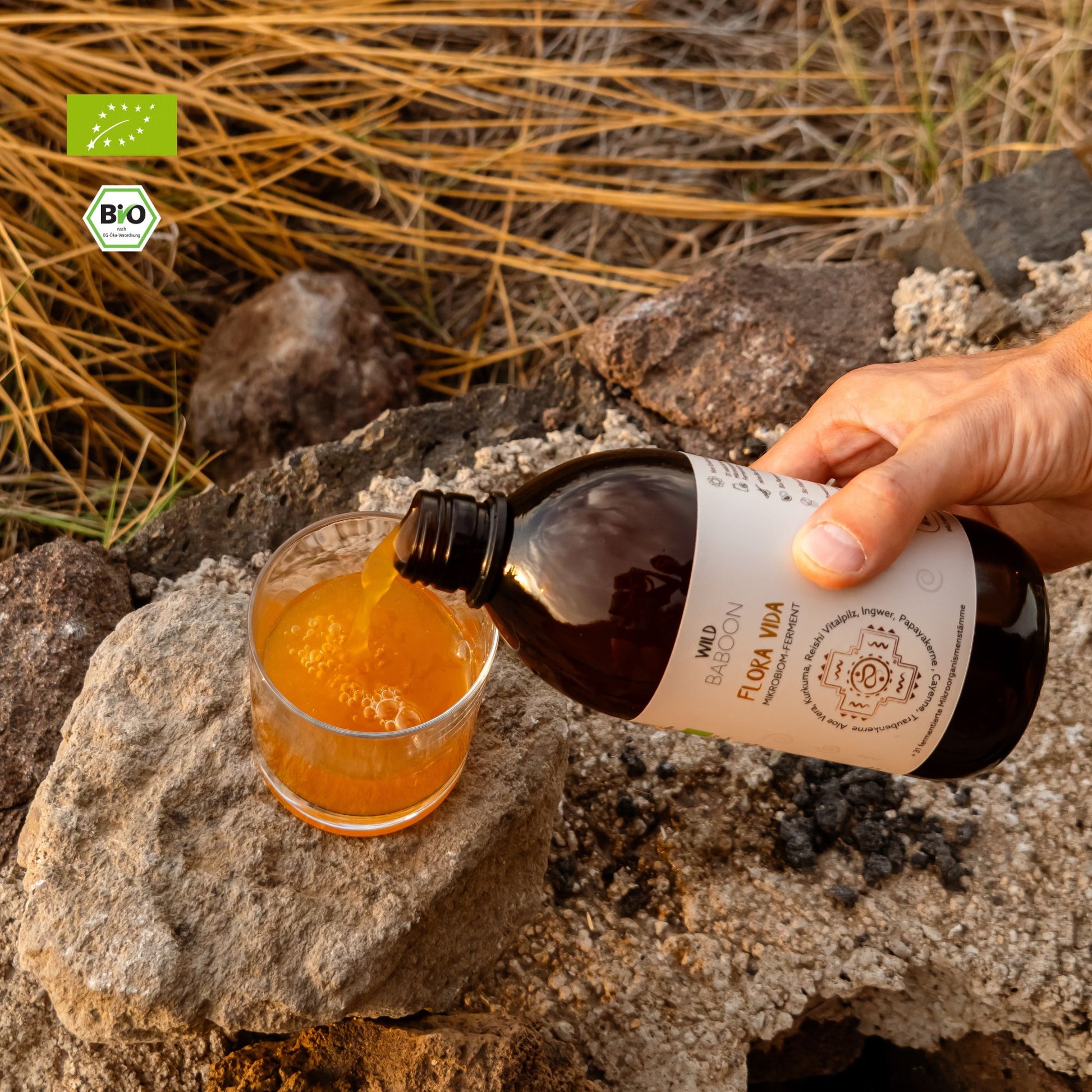 FLORA VIDA vereint sorgfältig ausgewählte Pflanzenkräfte wie Aloe Vera, Kurkuma, Ingwer, Reishi und Papayakerne in höchster Bio Qualität in einem einzigartigen, zweistufigen Fermentationsprozess. Durch diese natürliche Fermentation werden die wertvollen Inhaltsstoffe der Pflanzen aktiviert und in feiner verfügbare Formen umgewandelt.