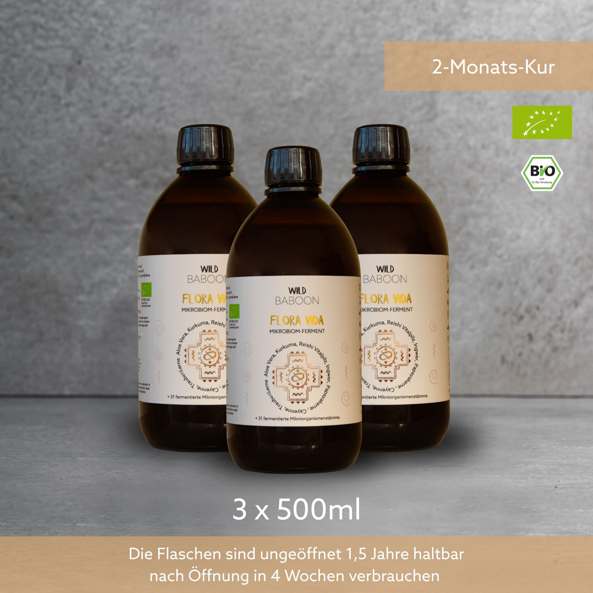 Im Gegensatz zu herkömmlichen Probiotika enthält FLORA VIDA keine isolierten Kulturen, sondern ein lebendiges, natürlich gewachsenes Ferment. Die 31 Mikroorganismen sind Teil des pflanzlichen Ferments und bilden gemeinsam mit Enzymen, sekundären Pflanzenstoffen und Vitalpilzen das Herzstück von FLORA VIDA.