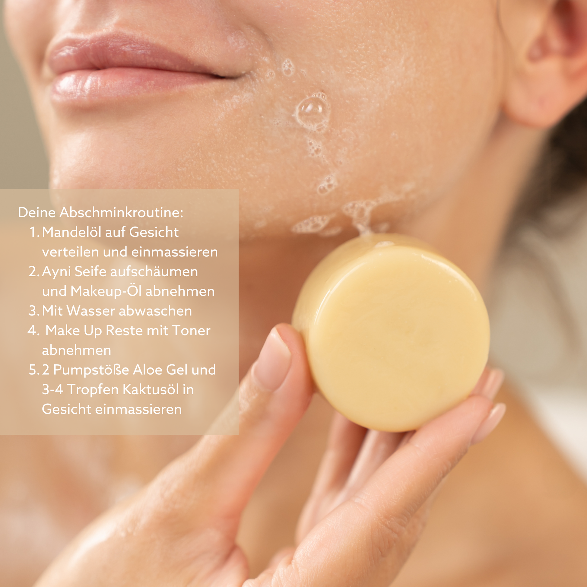 1. Beginne und beende deinen Tag, indem du dein Gesicht wäschst und mit der Ayni Naturseife reinigst. Bitte die Augen erst nach gründlichem Abspülen mit Wasser wieder öffnen:).